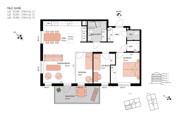 Planlösningen är genomtänkt och balanserad – med tydlig uppdelning mellan sociala ytor och privata rum. I hallen möts du av praktiska skjutdörrsgarderober och ett rymligt klädförråd som ger goda förvaringsmöjligheter direkt vid entrén. Härifrån öppnar bostaden upp mot en ljus och öppen kök- och vardagsrumsdel med plats för både matbord och soffgrupp.