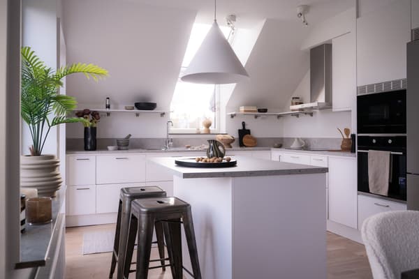Köket är från Vedum och levereras i vitt originalutförande – ett tidlöst och stilrent val som skapar en ljus och enhetlig känsla i rummet. Den grå laminatbänkskivan ger en mjuk kontrast till de släta vita luckorna. För dig som vill sätta din egen prägel på inredningen finns möjlighet att välja andra material och färger. Vitvaror från Electrolux ingår: dubbla kyl/frysar, inbyggd ugn och mikro samt integrerad diskmaskin.