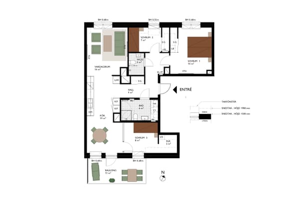 Vardagsrummet och köket bildar tillsammans bostadens hjärta – en öppen yta där du kan umgås, laga mat och koppla av. Härifrån når du även den rymliga balkongen om cirka 13 kvm i sydvästligt läge. Här finns utrymme för både loungemöbler, odling och en liten matgrupp.