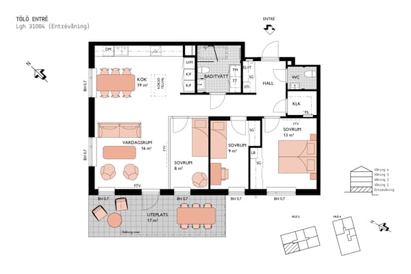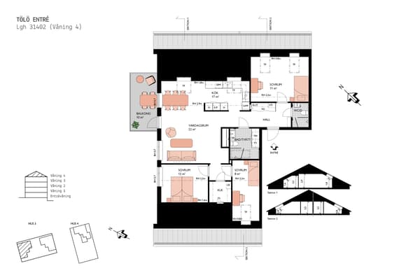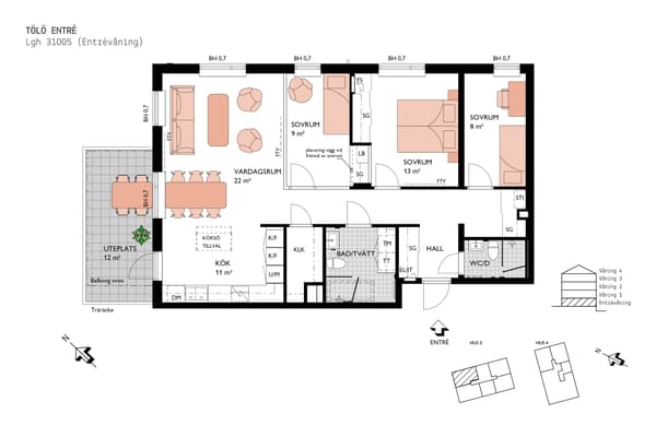 Bostaden är belägen i ett av byggnadens hörn, vilket ger ett generöst ljusinsläpp från flera väderstreck och skapar en lugn och privat känsla. Planlösningen är genomtänkt och balanserad – med tydlig uppdelning mellan sociala ytor och privata rum. I hallen möts du av praktiska skjutdörrsgarderober och ett rymligt klädförråd som ger goda förvaringsmöjligheter direkt vid entrén. Härifrån öppnar bostaden upp mot en ljus och öppen kök- och vardagsrumsdel med plats för både matbord och soffgrupp.