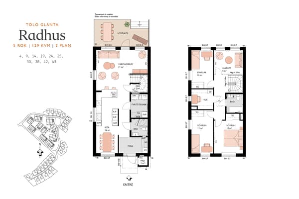 Det övre planet rymmer tre rymliga sovrum samt ett allrum som med fördel kan disponeras som ytterligare ett sovrum vid behov. Ett extra badrum på detta plan gör morgonrutinerna smidigare. Dessutom finns en generös klädkammare för smart förvaring.