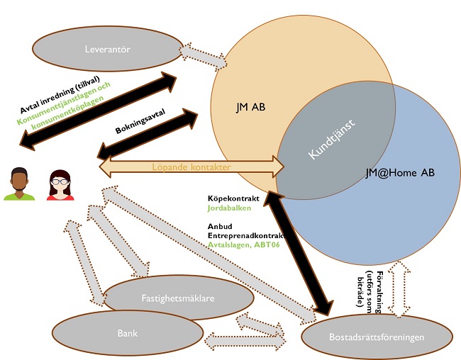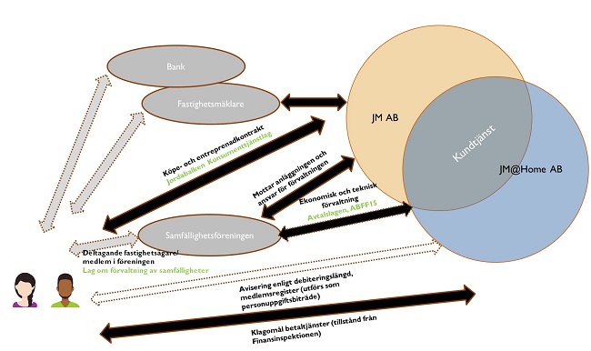 För att förstå det som beskrivs ovan kan det vara bra att förstå hur JM AB och JM@Home AB interagerar med andra personuppgiftsansvariga. Eftersom det är skilda regelverk för bostadsrätter och ägarlägenheter förklaras hanteringen i separata avsnitt.