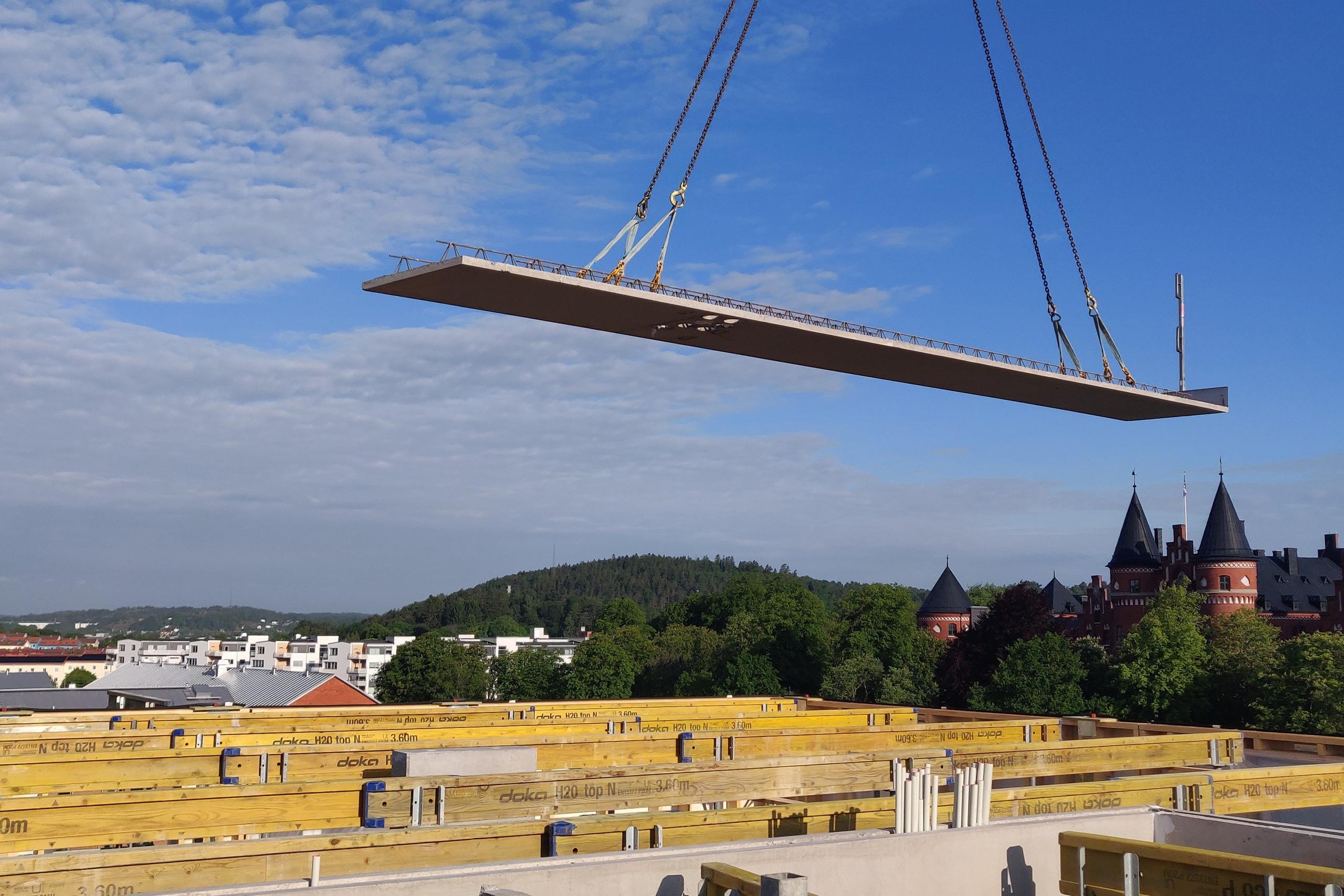 Förra veckan var jag med när en våning i trapphus ett skulle byggas på. Det första som görs är att plattbärlagen (som utgör mellanbjälklaget) läggs på. Dessa plattor är prefabricerade och transporteras hit till bygget. Med hjälp av byggkranen lyfts de sedan upp och placeras på väggarna på nedanstående våning.