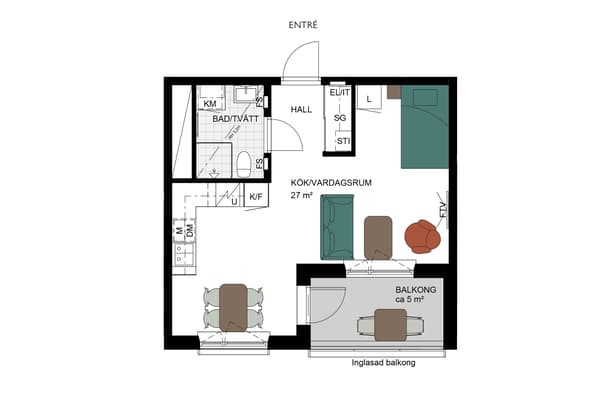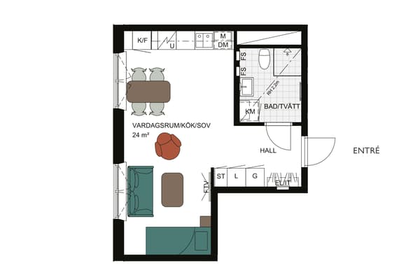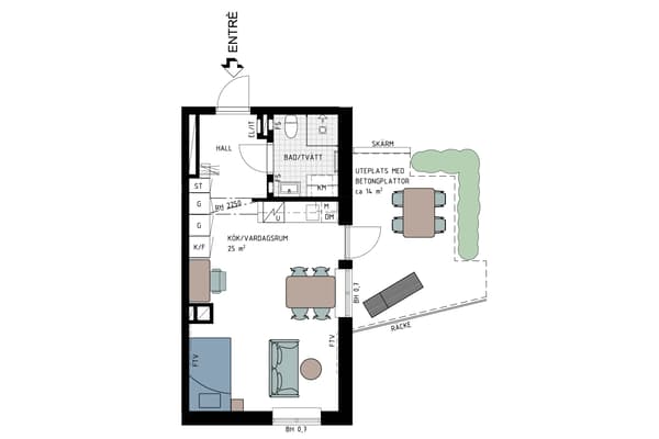 Marketta med uteplats mot väster. Kök och vardagsrum i öppen planlösning samt ett burspråk som lämpar sig för matplats. Förvaring i form av garderober i hallen. Duschrum med kombinerad tvättmaskin och torktumlare