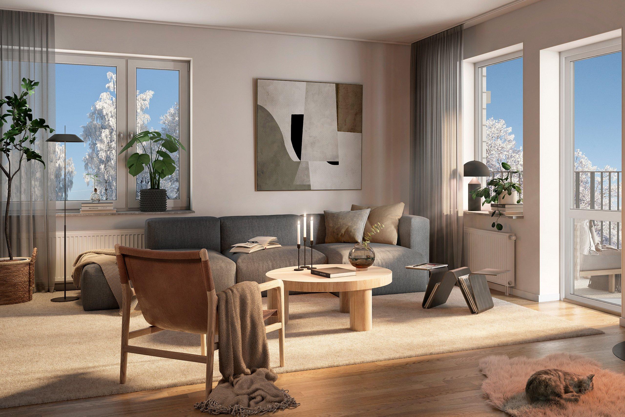 Trevlig öppen planlösning mellan kök och vardagsrum. Parkettgolv och ljusa väggar. Gott om plats för soffgrupp och matbord intill stora fönsterparti och ljusinsläpp från flera håll. Utgång till uteplatsen.