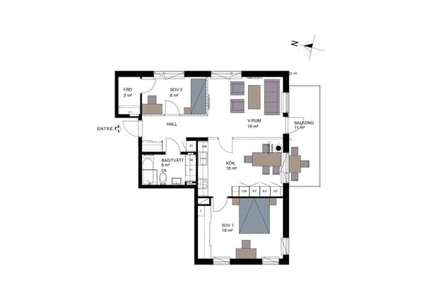 Fullutrustat kök med trevligt ljusinsläpp. Köksluckor och bänkskiva från Marbodal. Vitvarorna består av en integrerad diskmaskin, induktionshäll, varmluftsugn och mikro i högskåp samt två kyl/frys - allt från Electrolux.
