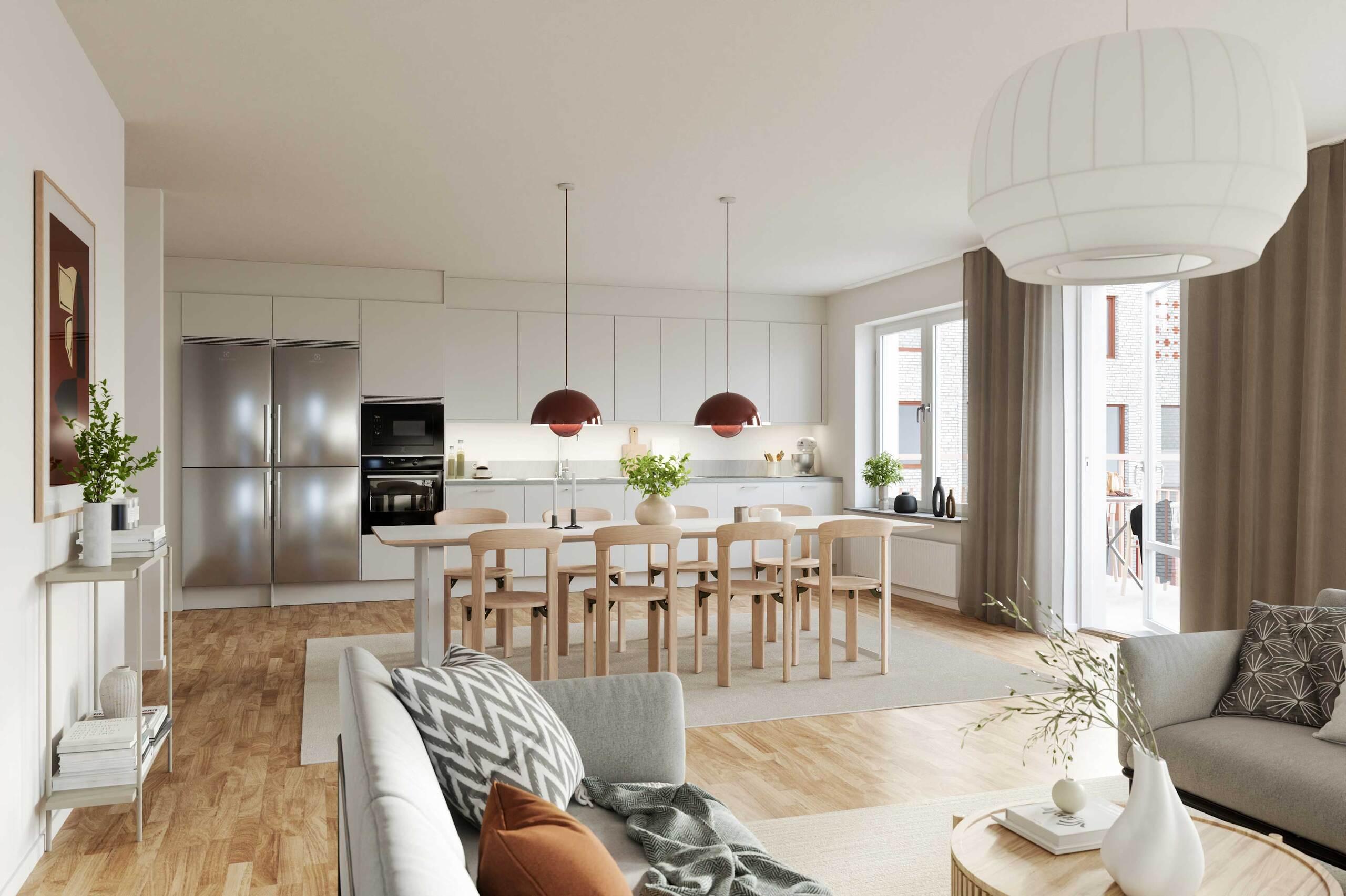 Generös femma om 122 kvm med alla bekvämligheter man kan önska av en nyproducerar bostad på centralt läge. Bostaden erbjuder ett generöst kök/vardagsrum i öppet samspel, 4 sovrum, 2 badrum, tvättstuga, skafferi och förråd. Perfekt lägenhet för köparen som kommer från villa och är van vid dessa funktioner. Som kronan på verket finns en balkong om hela 22 kvm som löper längs med kök/vardagsrum i härligt västerläge. Bostaden är inredd med kök från Vedum i stilren design och vitvaror från Electrolux. JM:s originalinredning är ett modernt men tidlöst koncept som tilltalar många.