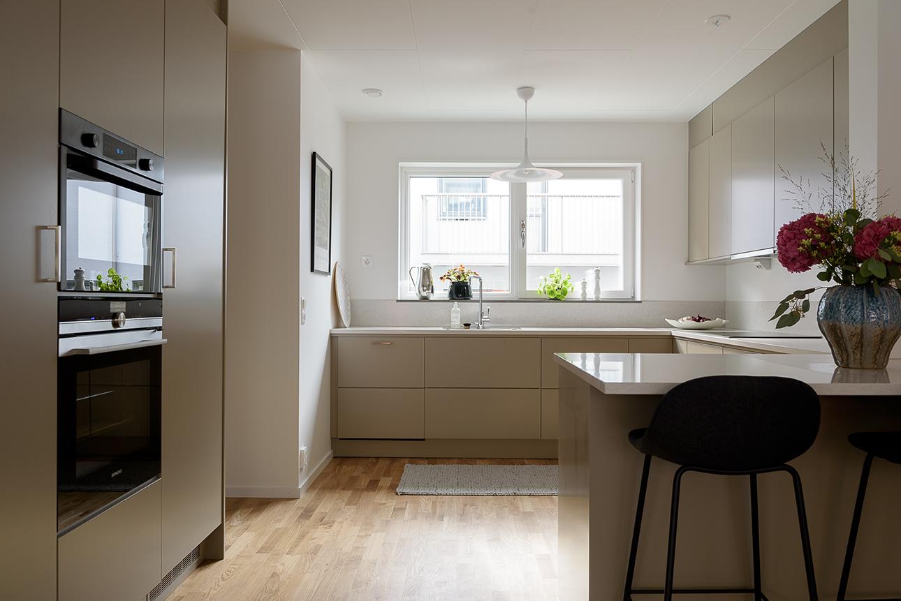 Bostaden är inredd med kök från Vedum i stilren design och vitvaror från Siemens. Köket är utrustat med kyl/frys, induktionshäll och integrerad diskmaskin samt ugn och mikrovågsugn. Helkaklat badrum med inredning från INR och spotlightbelysning i tak. Standarden är hög med bland annat vitlaserat ekgolv och helintegrerad kyl/frys. Bra förvaringslösningar med flexibla garderobssystem från Elfa och tillgång till ett förrådsutrymme i källarplan där det även finns cykelparkering.