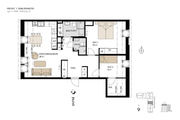 Genomgående trea i markplan med härlig uteplats mot innergården i väster, två sovrum och öppen planlösning mellan kök och sällskapsrum. I bostaden finns ett gäst-wc och ett badrum med tvättmaskin och torktumlare samt möjlighet att välja badkar.