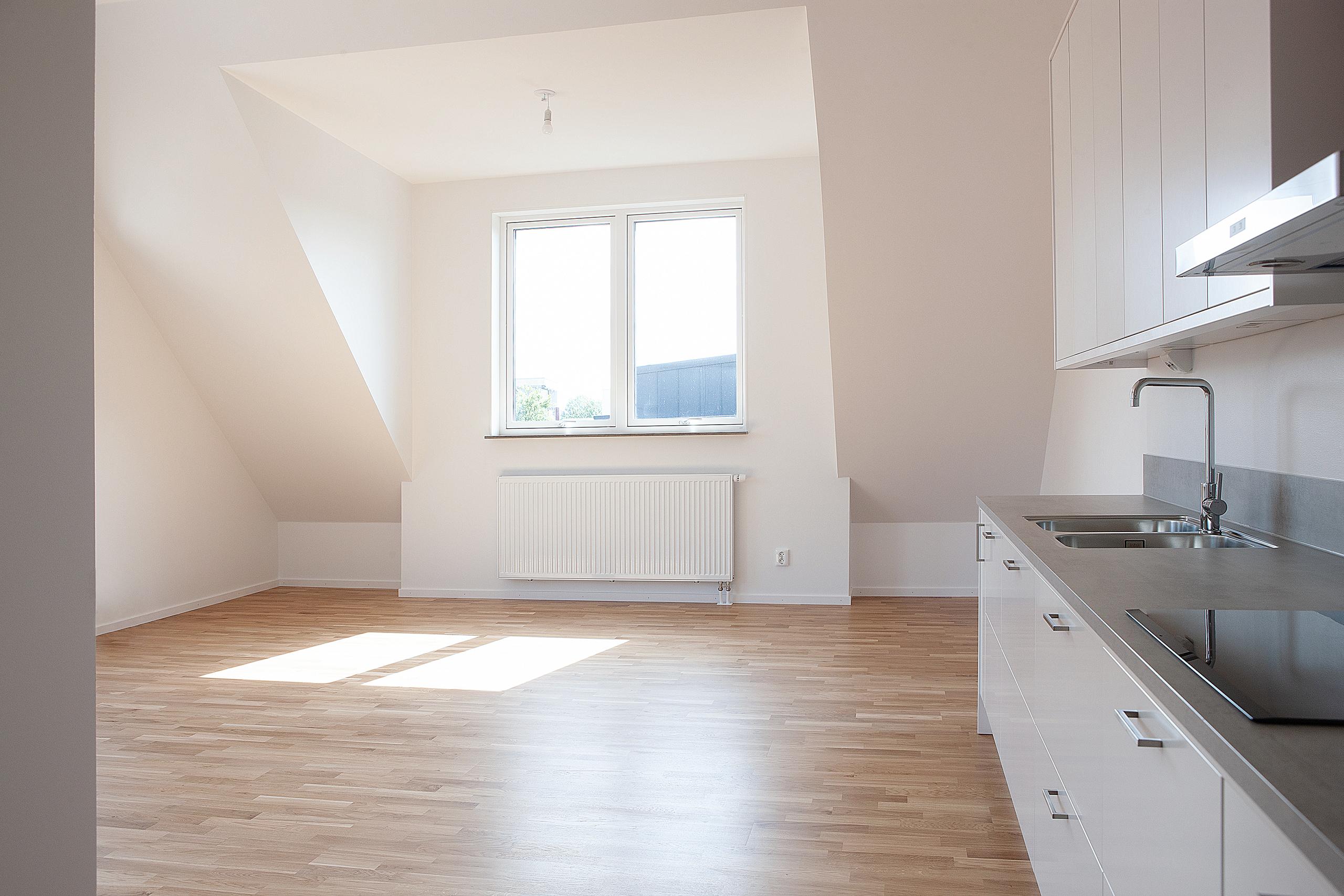 Gavellägenhet högst upp i huset med fönster i tre väderstreck. Tre rum varav vardagsrum i öppet samband med kök. Rymlig balkong om 13 kvm i nordostläge. Härlig takhöjd i köksdel om 3,4 m. Rymligt helkaklat badrum med tvättavdelning bestående av både tvättmaskin och torktumlare.