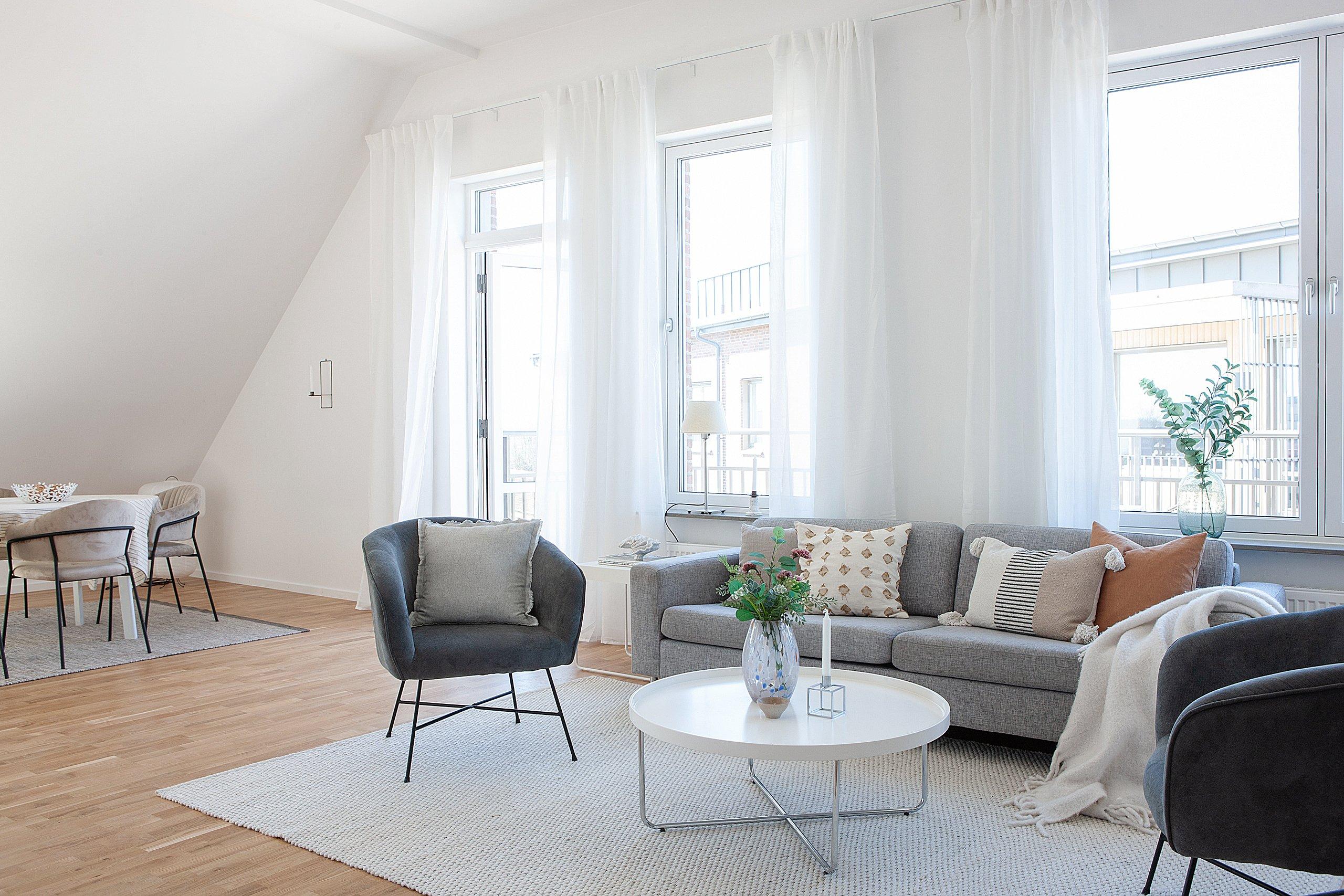 Fantastisk gavellägenhet om hela 122 kvm, högst upp i huset och med fönster i tre väderstreck. Separat kök med matplats vid fönster och vardagsrum med utgång till balkong om 13 kvm i sydvästläge. Härlig takhöjd i vardagsrumsdel om 3,4 m. Två helkaklade badrum med komfortgolvvärme varav det ena med tvättavdelning bestående av både tvättmaskin och torktumlare. Lägenheten är enligt planritning 4 rok men disponeras idag som 3 rok. Gardiner och gardinstång monterade i vardagsrum ingår vid köp.