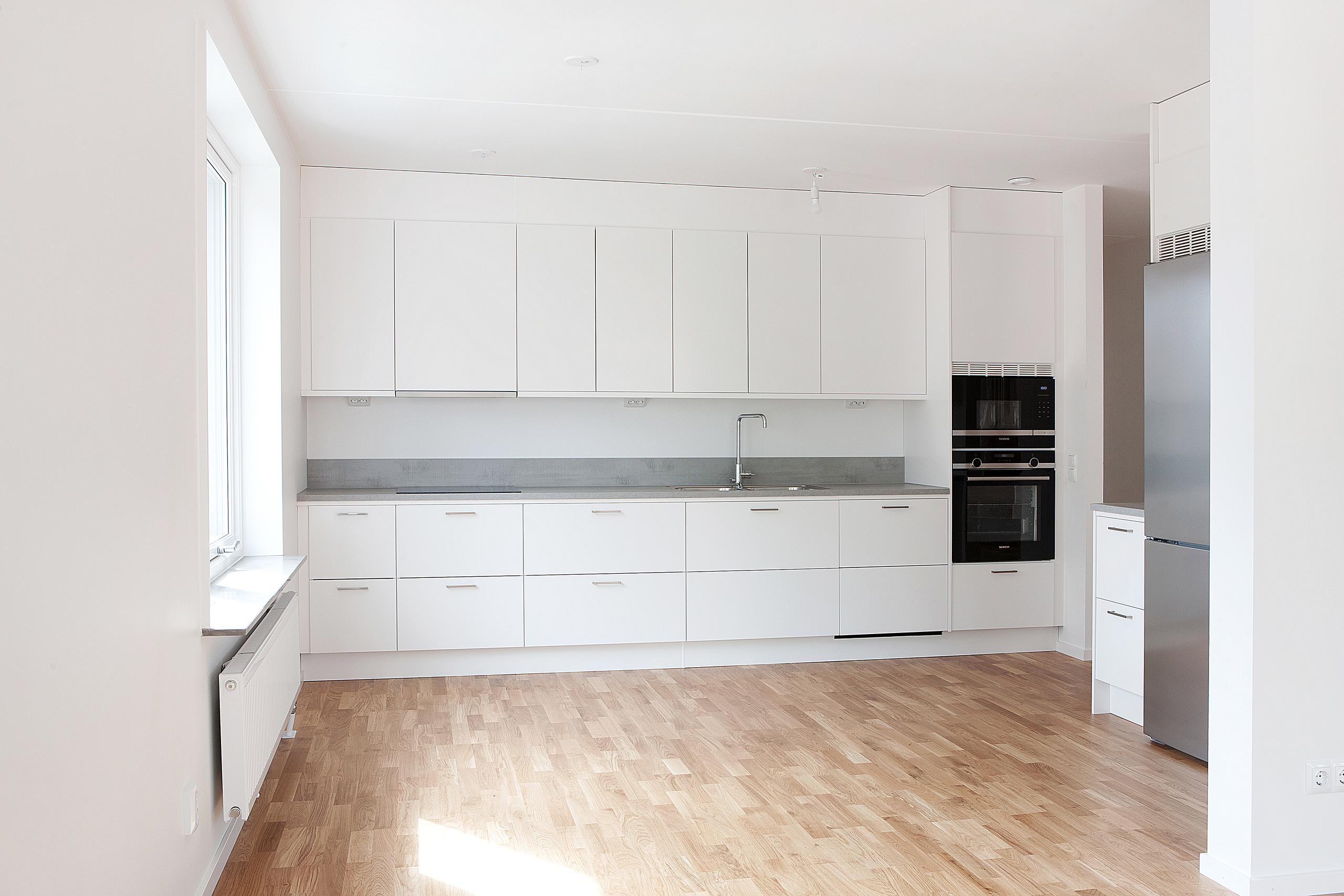Lägenheten är inredd med modernt kök med vita skåpluckor och lådfronter samt en stilren grå bänkskiva. Vitvarorna är i rostfritt utförande. Köksutrustningen består av kombinerad kyl/frys, induktionshäll, helintegrerad diskmaskin samt inbyggd varmluftsugn. Mikrovågsugn placeras i ett överskåp.