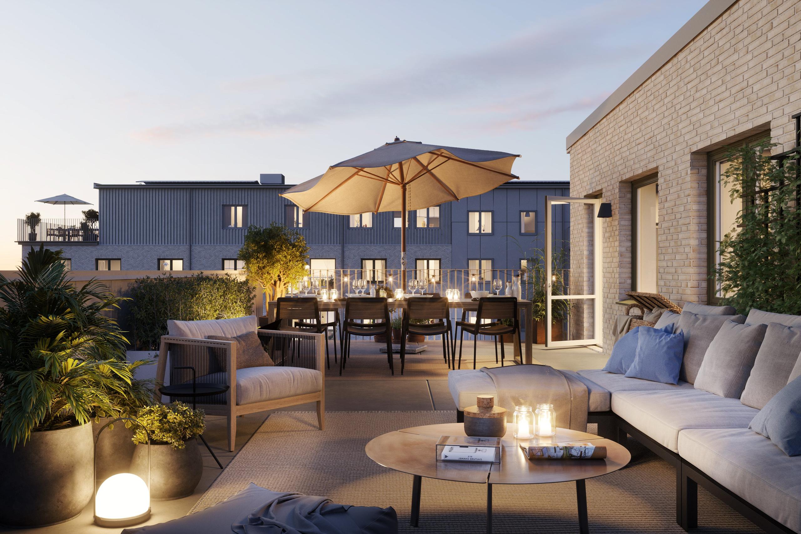 Imponerande fyra om 101 kvm med stor takterrass samt balkong. Gavelläget medför fönster i tre väderstreck som skapar en ljus och härlig bostad. Generöst kök/vardagsrum i öppen planlösning med möjlighet till köksö. I denna sektion av huset finns ej ytterligare våningsplan så man har inte någon granne ovanför sig och bra takhöjd om 2,7 m. Bostaden har tre bra sovrum där ett har tillgång till klädkammare. Det finns två badrum med dusch varav ett med tvättmöjligheter.