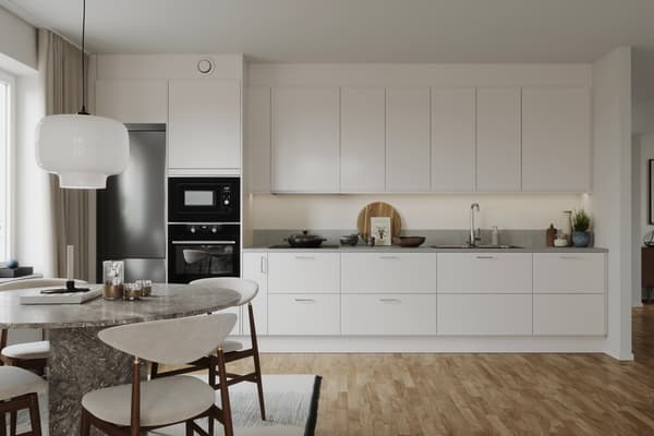 Bostaden är inredd med kök från Vedum i stilren design och vitvaror från Elektrolux. Köket är utrustat med kyl/frys, induktionshäll och integrerad diskmaskin samt ugn och mikrovågsugn. Helkaklat badrum med inredning från Svedbergs och spotlightbelysning i tak. Standarden är hög med JM originalinredning och möjlighet finns att göra tillval för att få en personlig touch. Bra förvaringslösningar med rymliga garderobspartier och/eller flexibla garderobssytem från Elfa”.
