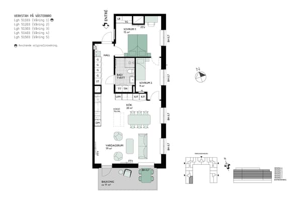 Bostaden är inredd med kök från Vedum i stilren design och vitvaror från Elektrolux. Köket är utrustat med kyl/frys, induktionshäll och integrerad diskmaskin samt ugn och mikrovågsugn. Helkaklat badrum med inredning från Svedbergs och spotlightbelysning i tak. Standarden är hög med JM originalinredning och möjlighet finns att göra tillval för att få en personlig touch. Bra förvaringslösningar med rymliga garderobspartier och/eller flexibla garderobssytem från Elfa.