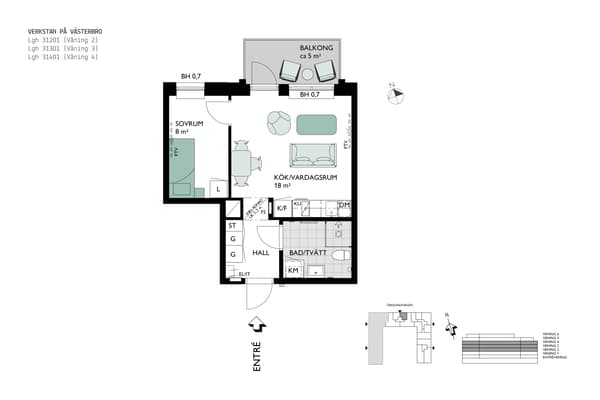 Två om 43 kvm med balkong i väst. Fullt utrustat kök i öppen planlösning. Badrum med kombimaskin. Sovrum med skjutdörrsgarderob.