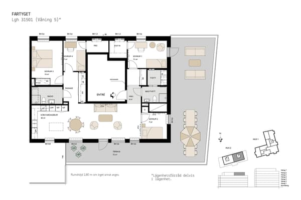 Planlösningen erbjuder fyra sovrum som ger möjlighet till både familjeliv, gästrum och hemmakontor. Två badrum gör vardagen enkel och smidig, och den genomtänkta förvaringen ger plats åt allt du behöver. Materialvalen är påkostade med stenkompositskivor i köket, massiva innerdörrar och golvvärme i badrummen. Här har inget lämnats åt slumpen utan varje detalj är vald för att skapa ett hem med långsiktig kvalitet.