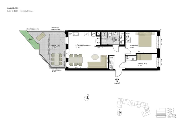 Badrummet är modernt inrett med kakel, klinker och utrustat med både tvättmaskin och torktumlare. Förvaringen är väl genomtänkt för att maximera funktionaliteten på den kompakta ytan. Det här är ett hem där varje kvadratmeter fyller sin funktion och gör vardagen enkel.