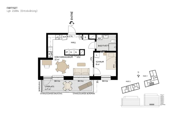 Fartyget är ett nyproduktionsprojekt med 89 bostäder där standarden är genomgående hög. Köken kommer från Vedum, vitvarorna från Electrolux och varje detalj är vald för att hålla över tid. Som boende får du tillgång till garage med laddplatser, cykelhus samt både bil- och cykelpool. Dockan är en stadsdel som sjuder av liv med restauranger längs kajen, caféer, mötesplatser och närheten till Malmös citykärna. Ett hem för dig som vill bo kompakt men ändå med känsla av livskvalitet.