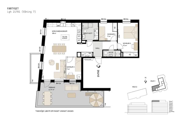 Planlösningen rymmer tre sovrum som ger flexibilitet för familj, gästrum eller hemmakontor. Det större sovrummet fungerar utmärkt som master bedroom medan de två mindre kan anpassas efter behov. Två badrum gör vardagen smidig. Det större är utrustat med tvättmaskin och torktumlare, medan det mindre fungerar som en praktisk gäst-wc med dusch. Förvaringen är välplanerad med garderober och klädkammare som gör att allt får sin plats.