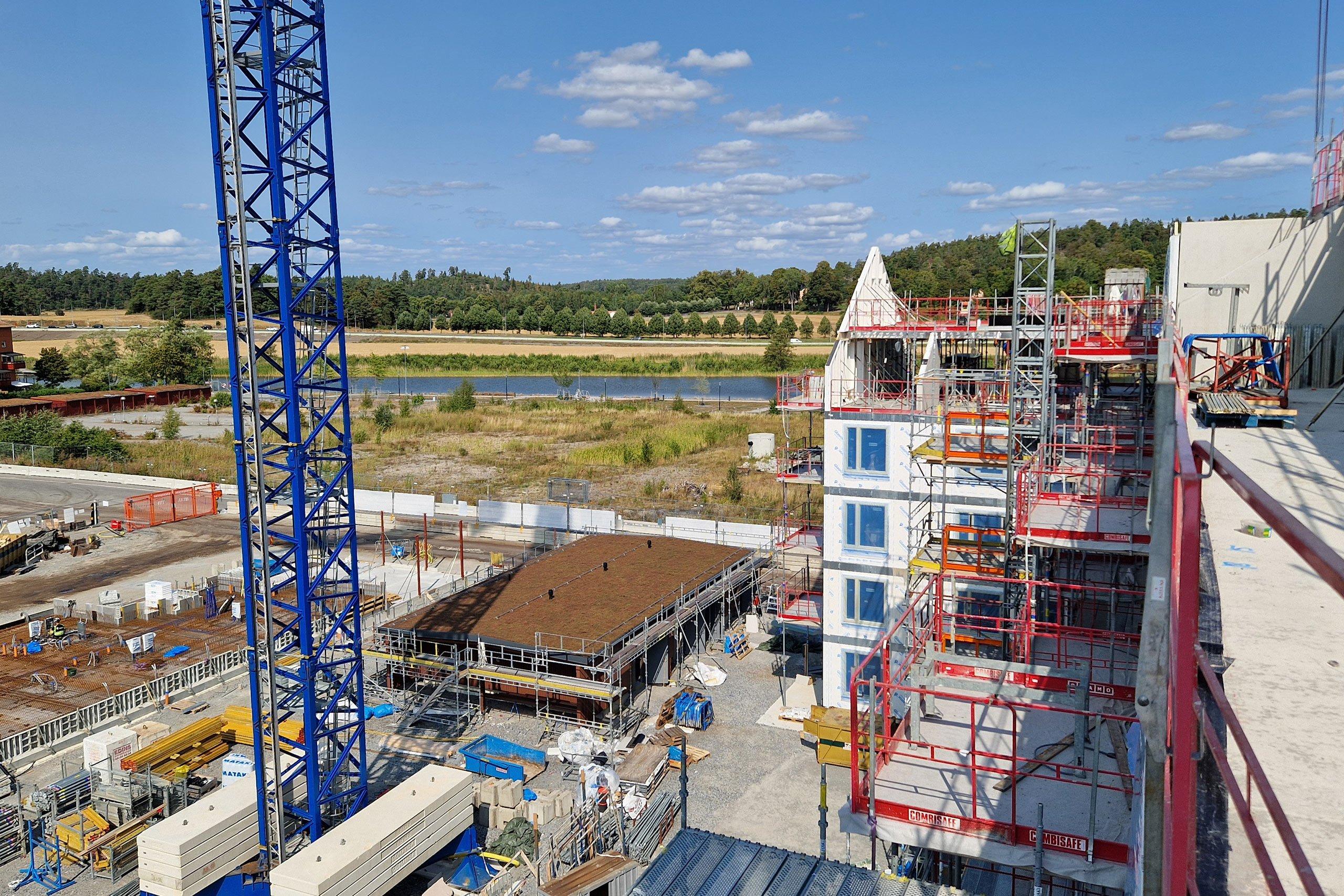 Till vänster på bilden ser du huset längs Utkiksgränd, där arbetet med bottenplattan pågår. På bilden syns även kvarterets gårdshus med sedumtak som redan är på plats.