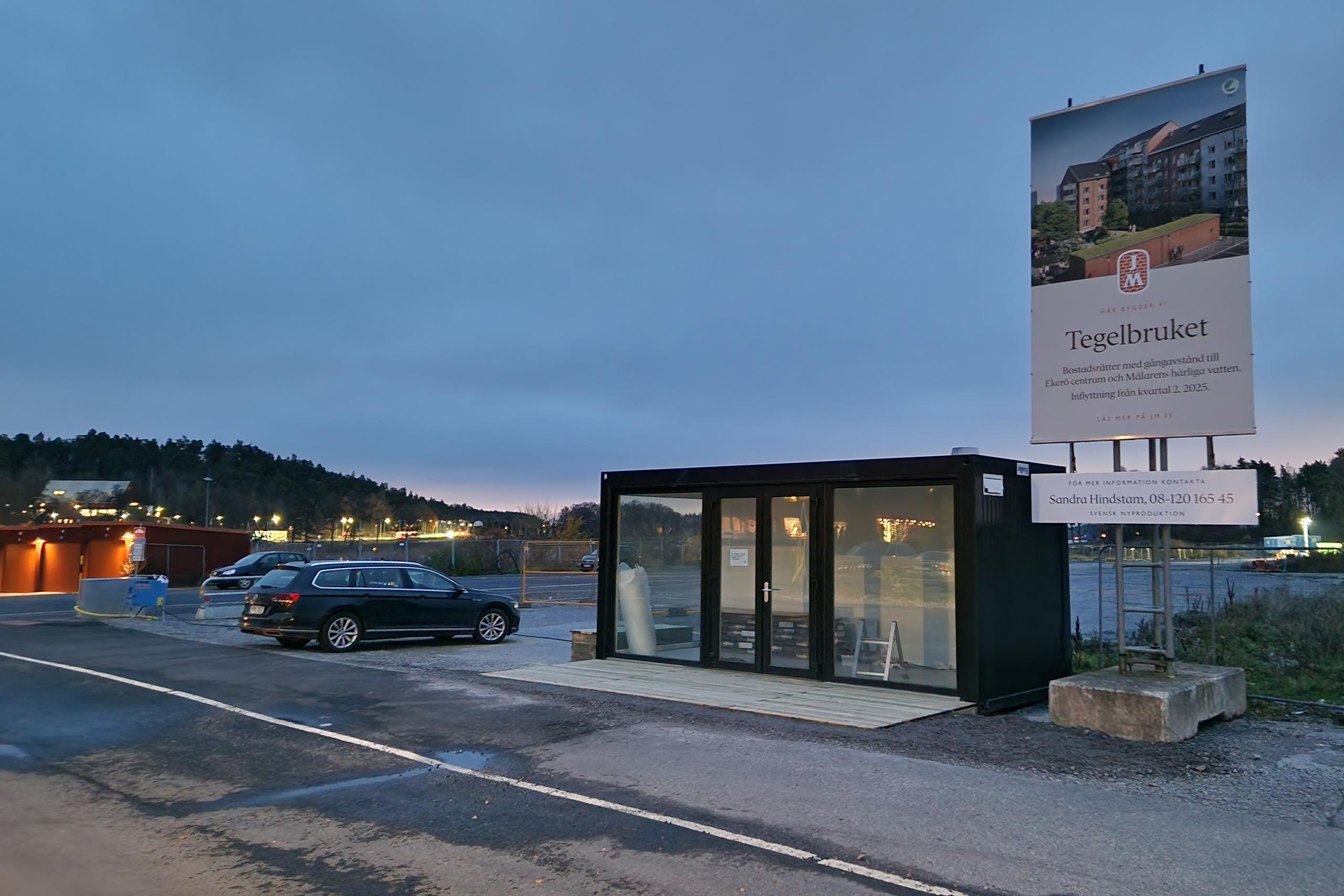 Nu är äntligen vår visningsbod på plats i Ekerö Strand. Här finns vi flera gånger i veckan och håller visning för vårt kvarter Tegelbruket.
