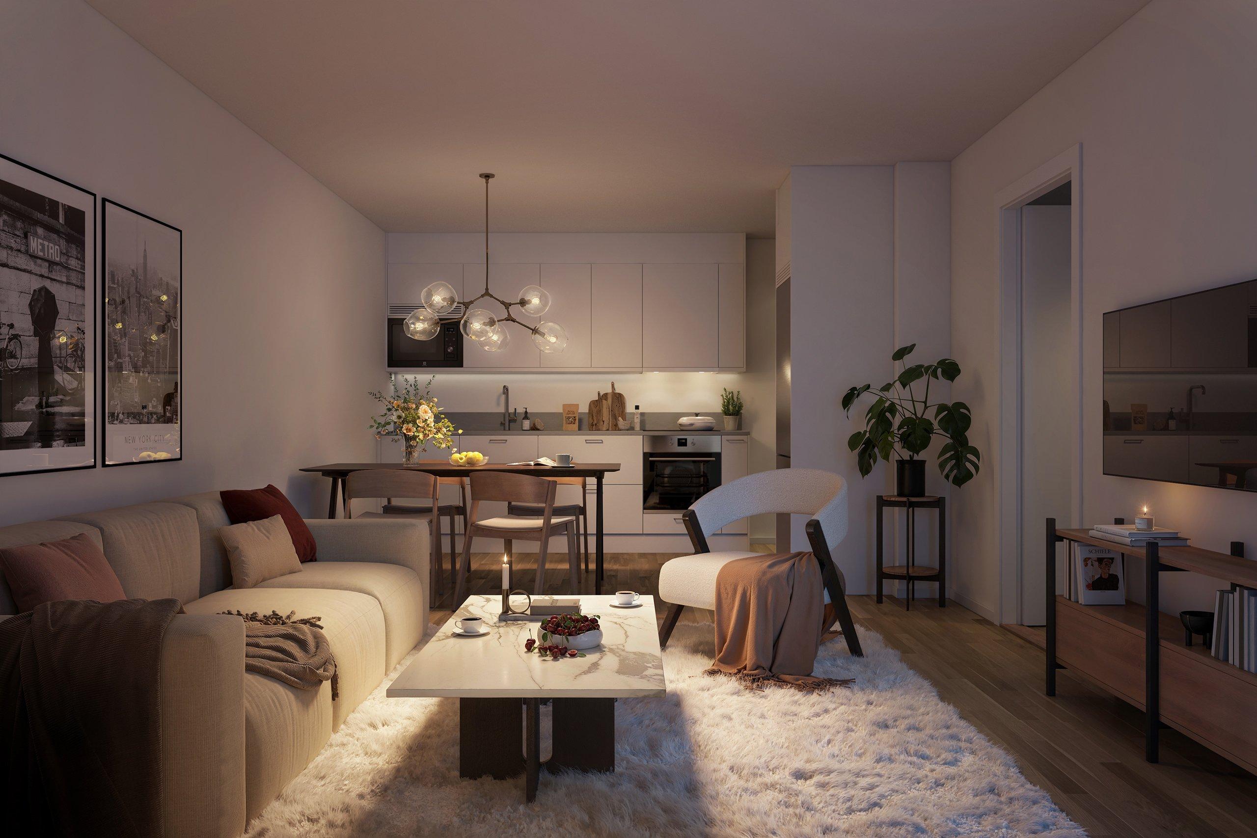 Oavsett lägenhetsstorlek så får du en bostad med genomstänkt planlösning och generöst ljusinsläpp. JM bygger bostäder för gemenskap och umgänge, med gott om förvaring i alla rum. Parkettgolvet i ek är både hållbart och skönt att gå på och tillsammans med vita målade väggar skapas en harmoni i den nyproducerade bostaden.