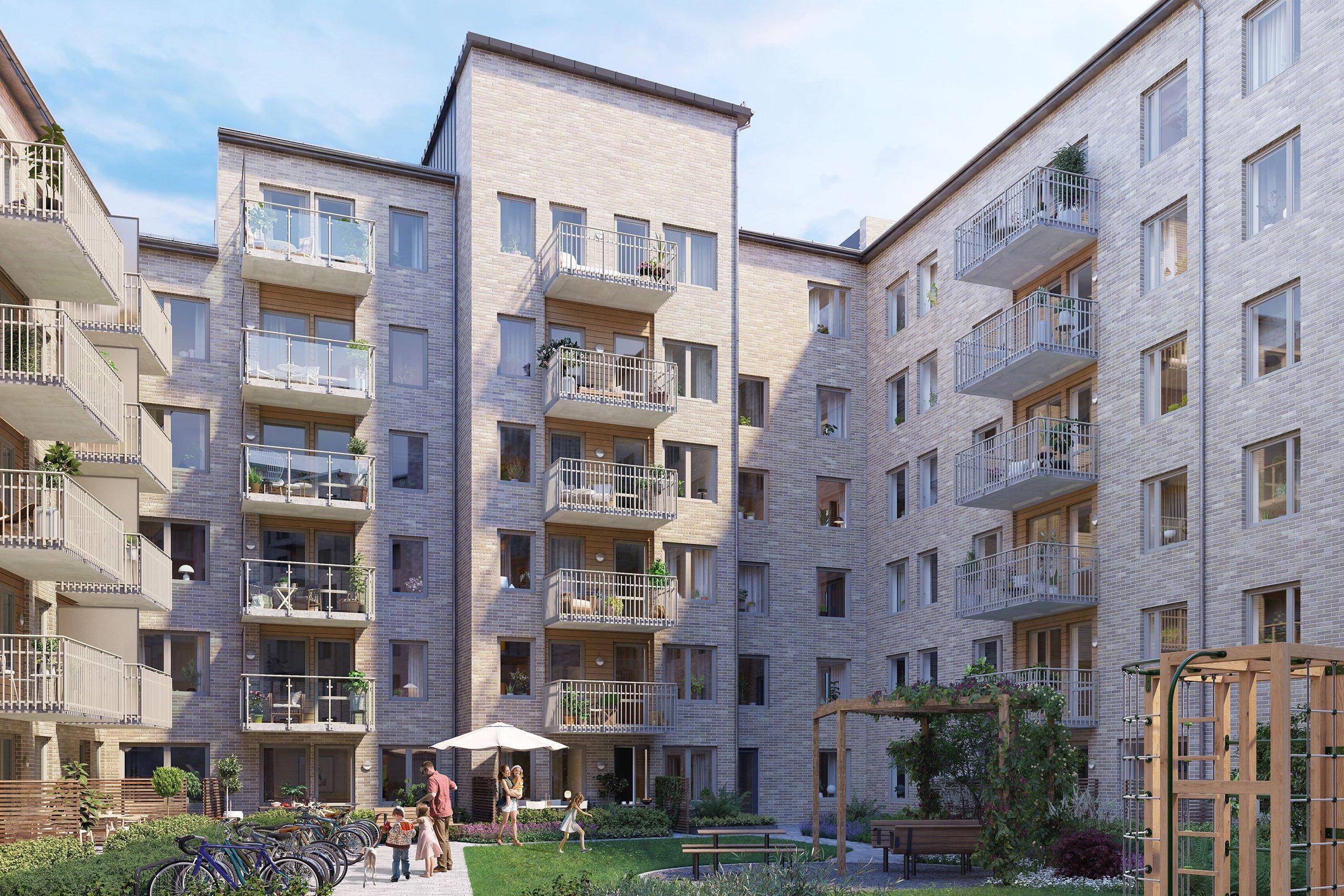 Kvarteret omsluter en stor grönskande innergård med planteringar och gott om plats för umgänge med vänner och familj.
