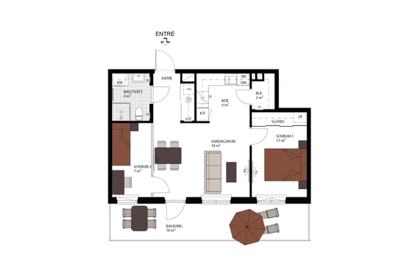 Den öppna planlösningen mellan kök och vardagsrum bjuder in till sociala sammanhang och rymmer både matbord och soffgrupp. Om så önskas kan en vägg väljas bort och skapa ett större vardagsrum. Härifrån kliver du rakt ut till en generös uteplats om ca 21 kvadratmeter med ett lugnt södervänt läge – en perfekt plats för odlingar, morgonkaffet eller sena sommarkvällar med vacker utsikt över vattnet.