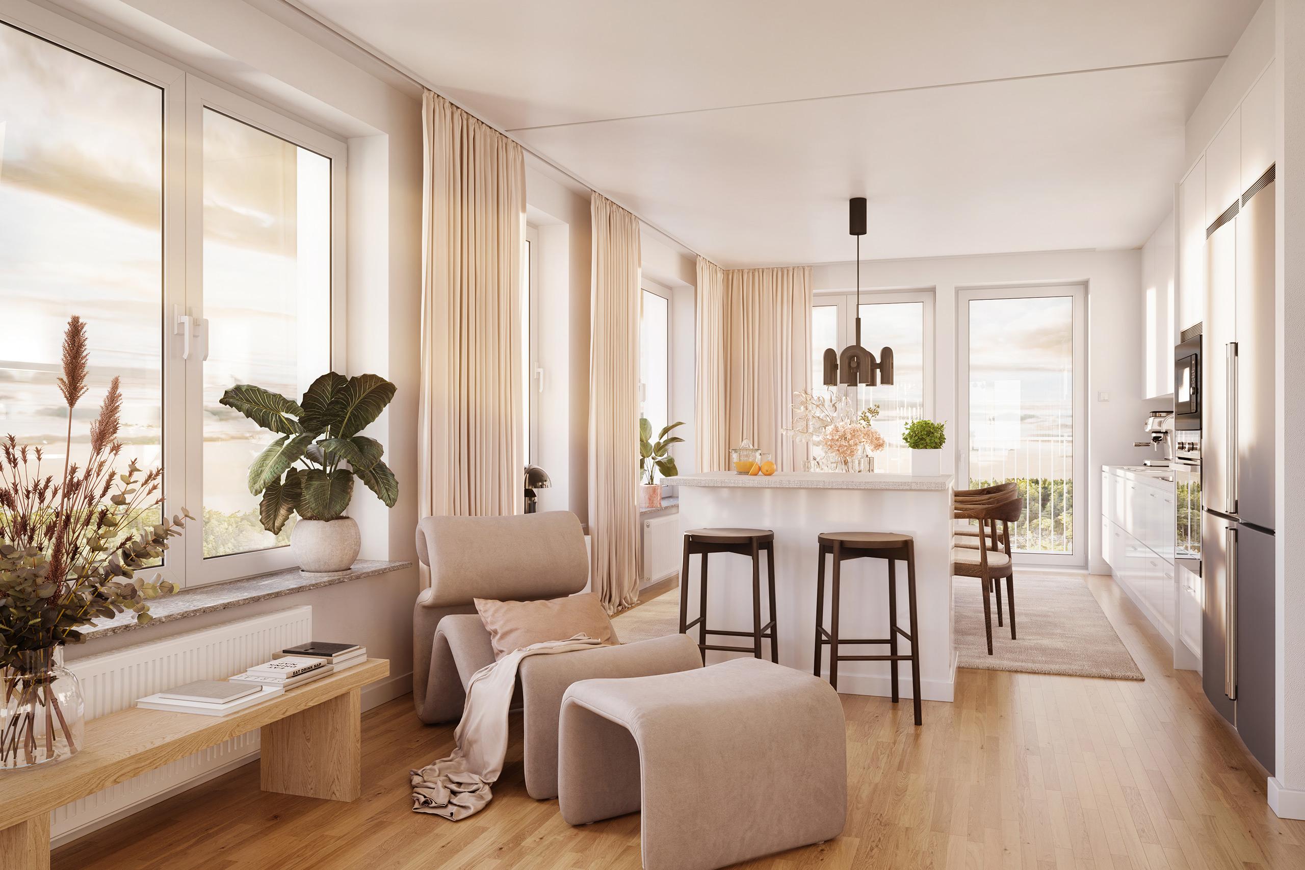 Bostäderna i Kvarnholmens Udde karaktäriseras av ett skönt söderläge och närheten till vattnet. Här bor du med vackra ljusinsläpp, öppna ytor med plats för umgänge och en stilren inredningen vars bas utgörs av vita väggar och mattlackad ekparkett.