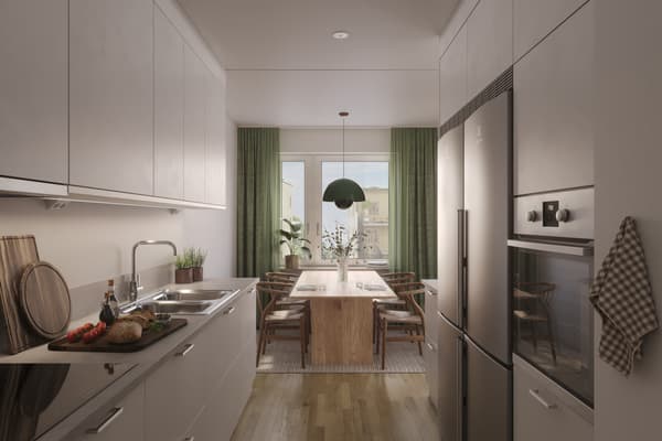 Köket är rymligt och socialt med plats för ett stort matbord – perfekt för både vardagsmiddagar och större bjudningar. I denna lägenhet finns också möjlighet att göra tillval på köksö. Intill ligger vardagsrummet som erbjuder gott om plats för soffa och TV-möbel samt utgång till den stora balkongen i västerläge där eftermiddags- och kvällssolen kan avnjutas.
