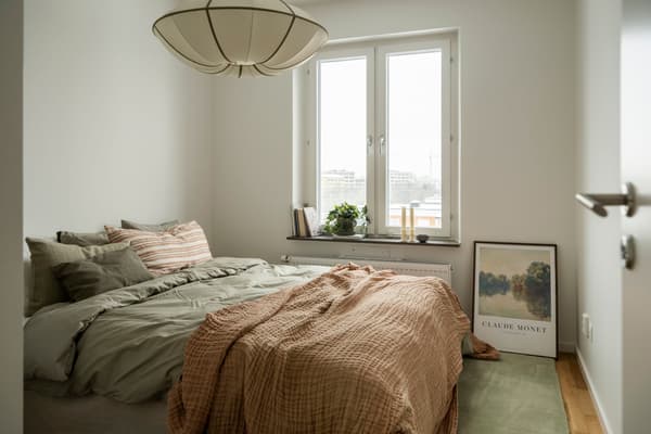 Sovrummet ger gott om plats för en dubbelsäng och erbjuder förvaring genom en rymlig skjutdörrsgarderob. Badrummet har ett grått klinkergolv och vita kaklade väggar. Dessutom finns en kombinerad tvättmaskin/torktumlare för extra bekvämlighet.