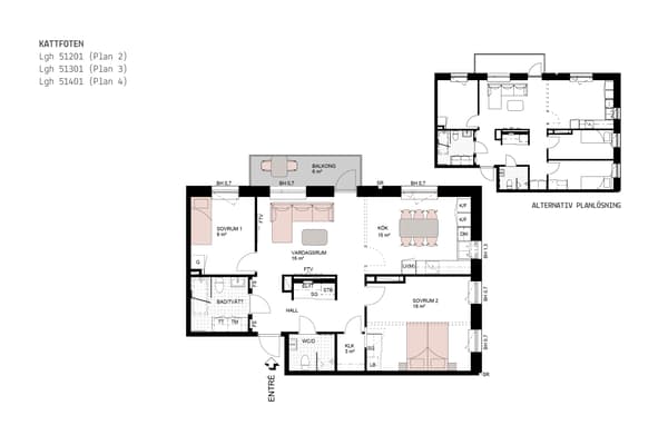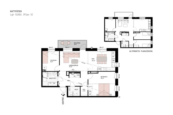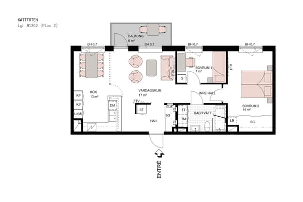 Bostaden är genomgående med en generös yta i hallen som har goda förvaringsmöjligheter i skjutdörrsgarderob.