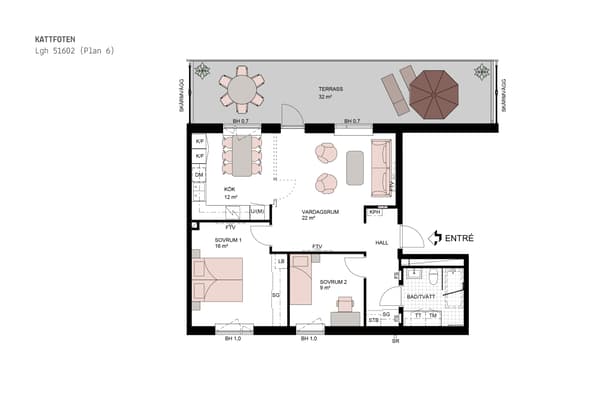 Köket och vardagsrummet utgör tillsammans bostadens sällskapsyta och härifrån når man den stora uteplatsen som ligger i sydväst. Köket är modernt med vita skåpsluckor som harmoniserar med den gråa bänkskivan som spänner sig en bit upp på väggen och utgör en bakkantslist. Kyl, frys, rostfri blandare, diskmaskin samt ugn som noga är utvalda för att lyckas i köket.