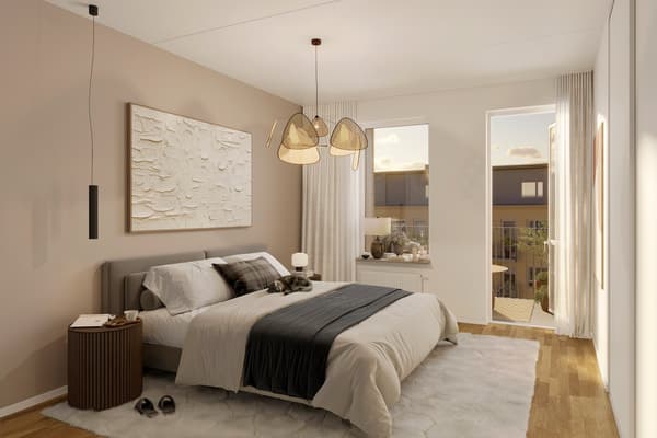 I bostadens master bedroom finns plats för dubbelsäng och annan möblering och här finns även en klädkammare med gott om plats för förvaring.