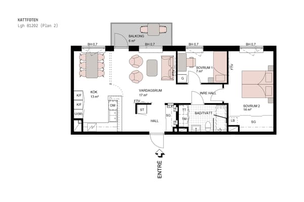 Köket är modernt och har vita köksluckor samt en grå bänkskiva som spänner sig en bit upp på väggen och utgör en bakkantslist. Rostfria vitvaror med matchande rostfri blandare. Energieffektiv helintegrerad diskmaskin, induktionshäll, samt ugn. Vardagsrummet intill köket bjuder på fina ytor och möjlighet att gå ut på lägenhetens stora och soliga terrass som ligger i sydväst, vilket betyder många soltimmar. Två bra sovrum med garderober i båda.