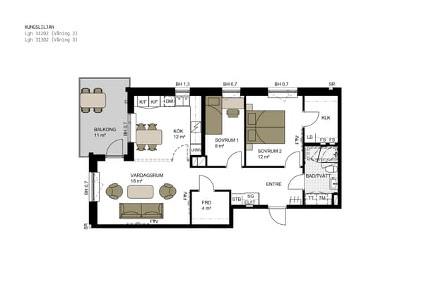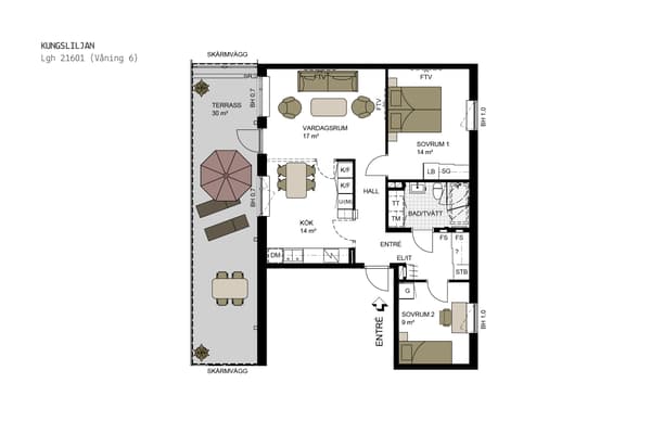 Bostaden är yteffektivt planerad utifrån en öppen planlösning med kök och vardagsrum på ena sidan av lägenheten och sovrummen på motsatt sida. Sällskapsdelen är generöst tilltagen med separat plats för matbord vid fönster och gott om plats för soffgrupp samt annan möblering. Den soliga terrassen som sträcker sig runt hela lägenheten skapar ett djup till och här kommer man spendera många soliga stunder.
