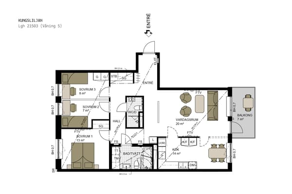 Till vänster från entrén öppnar sig bostadens sociala del som förlängs från vardagsrummet med uteplats mot innergården och här finns det generöst med plats för matbord och soffgrupp. Uteplatsen är hela 19 kvm, vilket ger rejält med plats för matbord, soffa, krukor och annat möblemang.