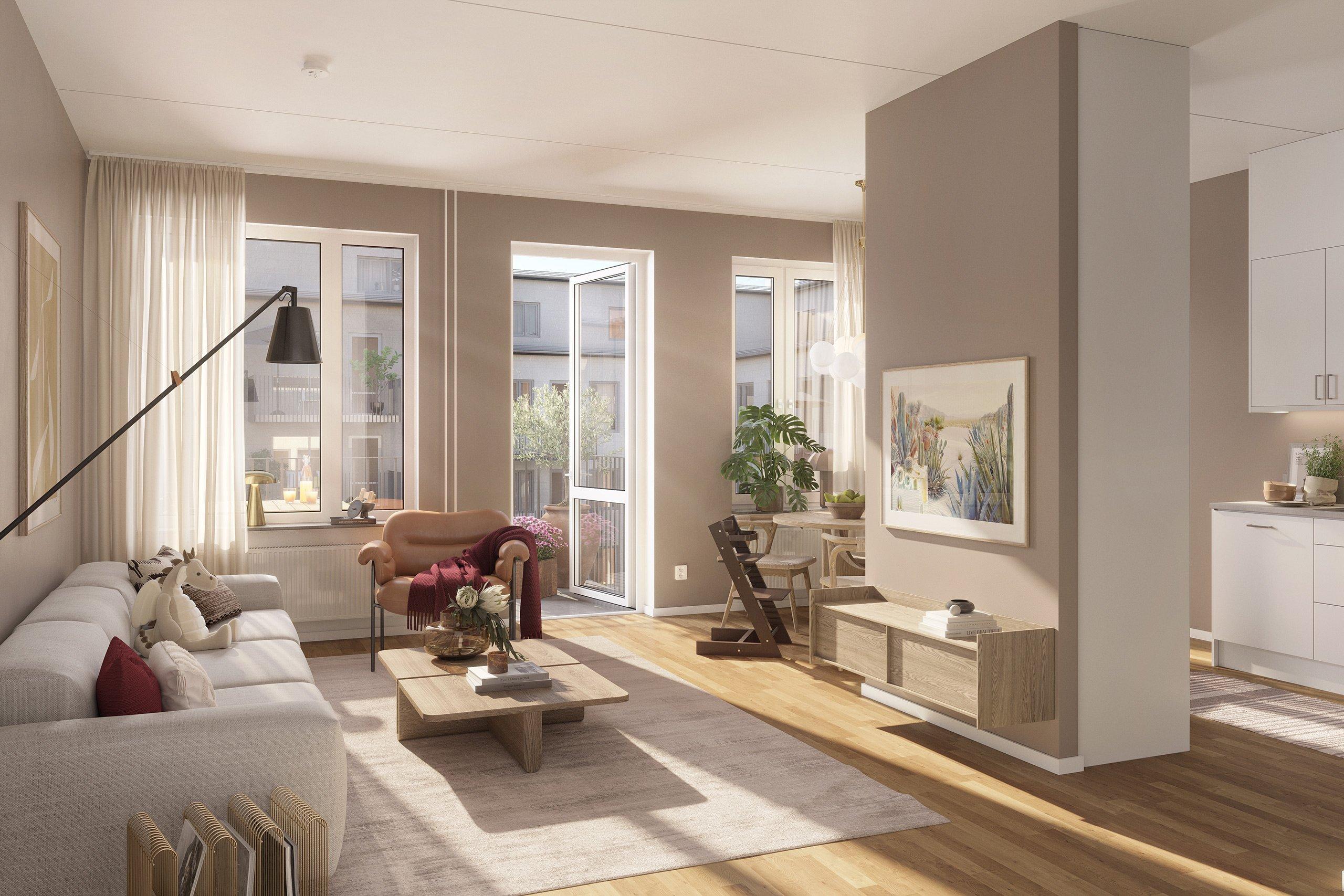 Bostäderna i Kungsliljan har öppna och sociala planlösningar. Väggarna målas vita och på golven läggs ett tåligt parkettgolv i ek. Det ger en bra bas när du ska inreda ditt nya hem med dina favoritmöbler och personliga detaljer.