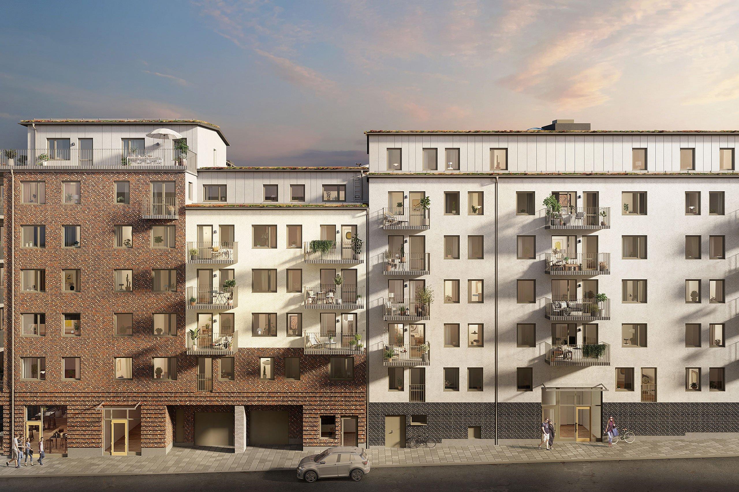 De flesta bostäder får balkong, alternativt uteplats med trätrall. Alla lägenheter högst upp i huset får takterrass med vacker utsikt.