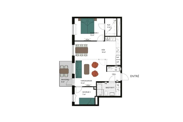 Entrén har en elegant och lite mörkare karaktär. Blicken leds naturligt ut mot terrassen och Årstavikens vatten. Hallen erbjuder genomtänkt förvaring för ytterkläder och skor. Golv i grafitgrå Dekton bildar en elegant kontrast mot hemmets ljusa färgskala.