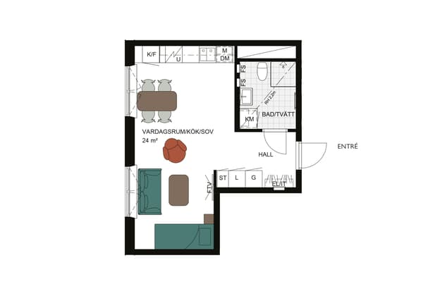 Bostaden har en modern och stilren färgsättning som presenteras genom JM Original, väggarna är målade i vitt och golvet är en ljuspigmenterad trestavsparkett i mattlackerad ek. Här erbjuds även möjligheten att välja mellan olika tillvalskombinationer, till en kostnad för att skapa ett hem utefter dina egna önskemål.