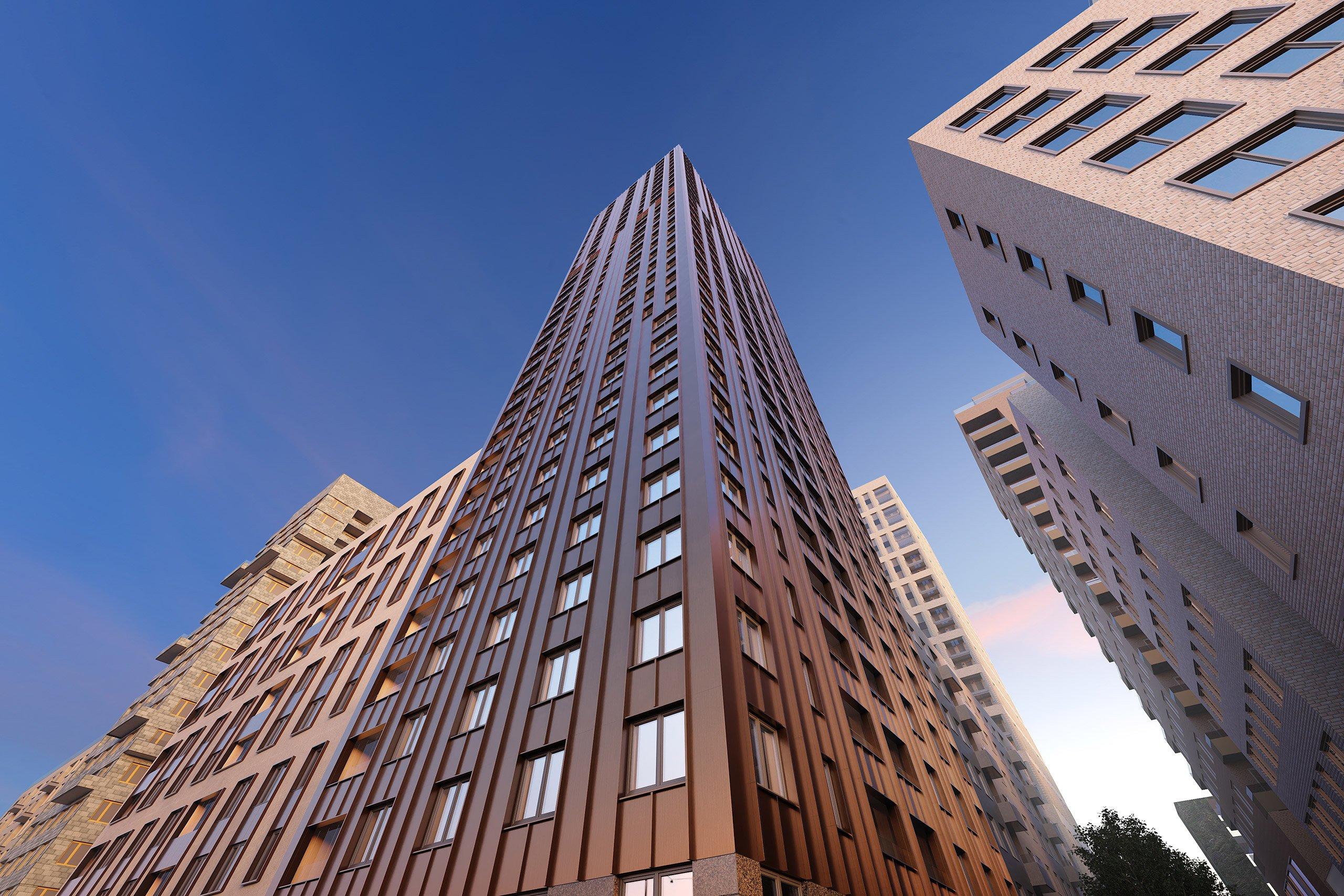 Spiran har en stilren arkitektur med fasad i bronsfärgad aluminiumkomposit med sockelvåning i natursten.