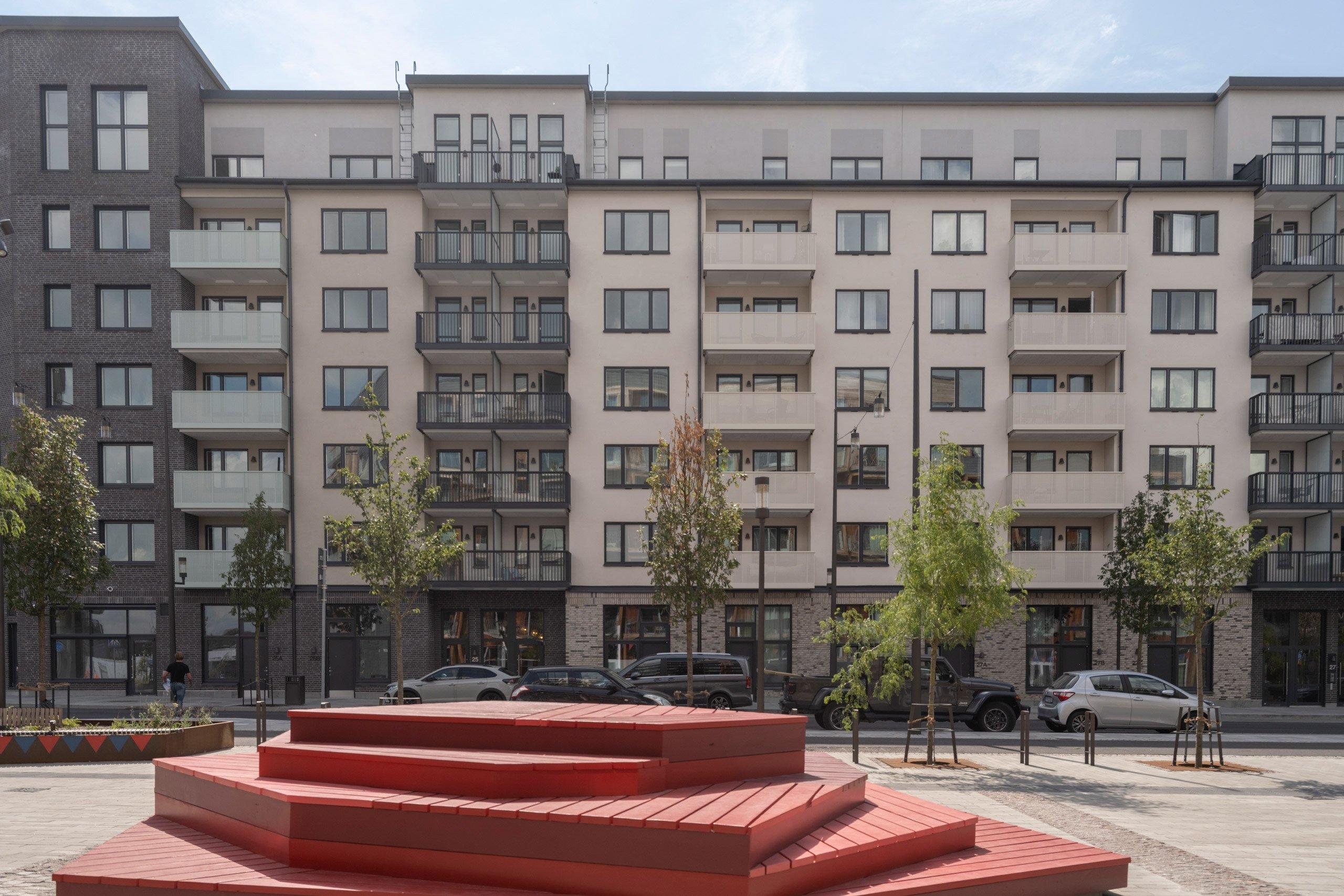 Bunkhagen Norra har en härligt grönskande innergård med gott om plats för umgänge med grillplats, pergola och lekplats för de minsta.