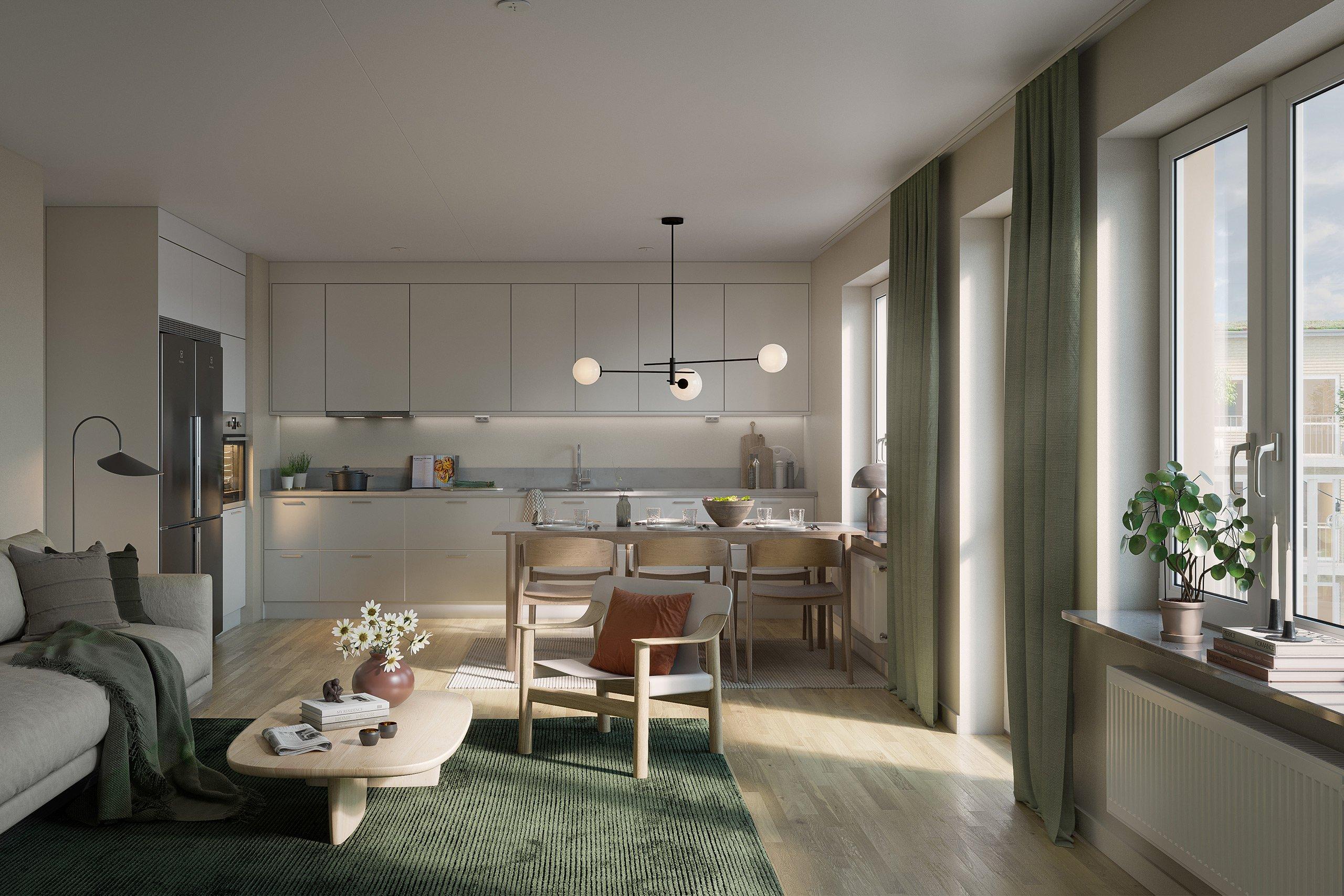 Bostäderna i Roden är inredda med ett stilrent formspråk som står sig år efter år. Här möts du av vackra ljusinsläpp och öppna ytor som skapar rymd medan den stilrena ekparketten och de vitmålade väggarna skapar en klassisk helhet.