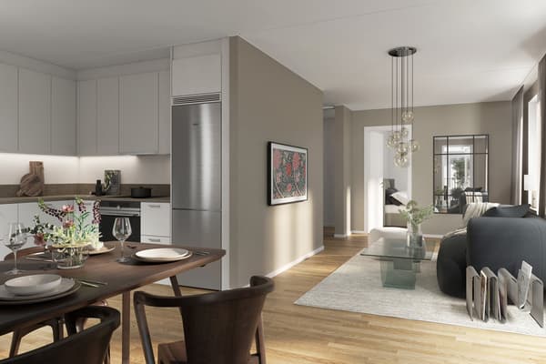 Trevligt vardagsrum med härligt ljusinsläpp från fönster och balkongdörr. Möjlighet med tillvalsvägg mot matplats. Gott om plats för en soffgrupp.