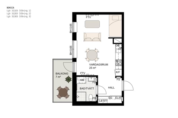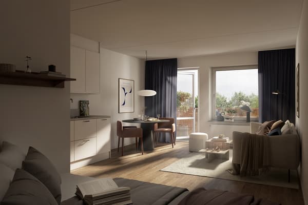 Det öppna vardagsrummet erbjuder gott om utrymme för soffgrupp och matplats. Här finns även altandörren som leder ut till balkongen, perfekt för sociala stunder och avkoppling.
