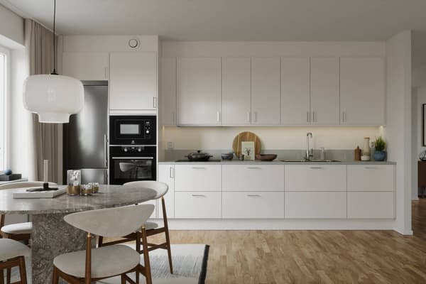 Köket har en modern inredning med släta, vita skåpluckor och en grå bänkskiva med matchande bakkantslist. En LED-list med dimmer ovanför bänken ger energieffektivt och stämningsfullt arbetsljus. Väggskåpen är handtagslösa för ett stilrent intryck, medan lådor och bänkskåp har rostfria handtag som bryter av på ett smakfullt sätt. Köket är utrustat med induktionshäll, ugn och mikrovågsugn placerade i praktiskt högskåp samt integrerad diskmaskin. Kyl/frys i rostfritt stål från Electrolux.