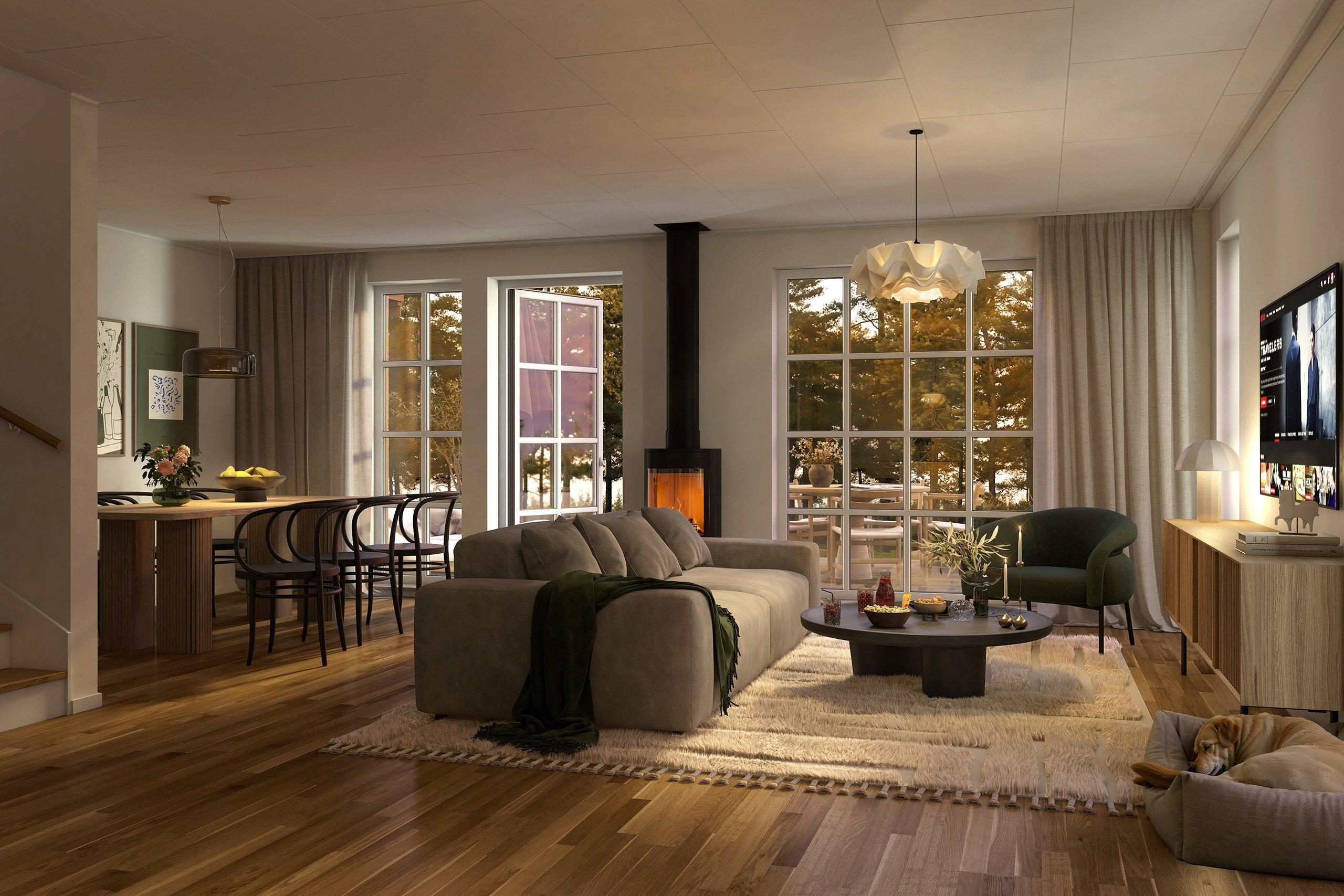 Det rymliga vardagsrummet erbjuder gott om utrymme för en stor soffgrupp samt en extra matplats med härligt ljusinsläpp från flera håll. Här finns också en altandörr som leder ut till den generösa uteplatsen, perfekt för sociala stunder och avkoppling. Extra förvaring/städ i förråd under trapp.