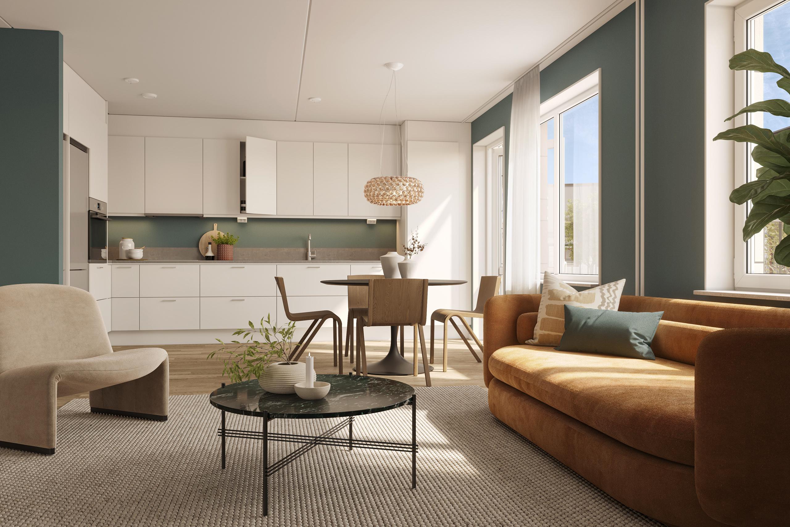 När du kliver in genom dörren möts du av en rymlig hall med en skjutdörrsgarderob som löper längs ena väggen. Vidare in i bostaden finner du köket i öppen planlösning mot vardagsrummet. Köket kommer komplett utrustat med bra arbetsytor och den maskinella utrustningen som man kan önska från en modern bostad så som diskmaskin, induktionshäll, ugn samt kombinerad kyl och frys. Köket erbjuder även plats för ett generöst matbord för den som uppskattar många vänner och familjemedlemmar på middagsbjudning.
